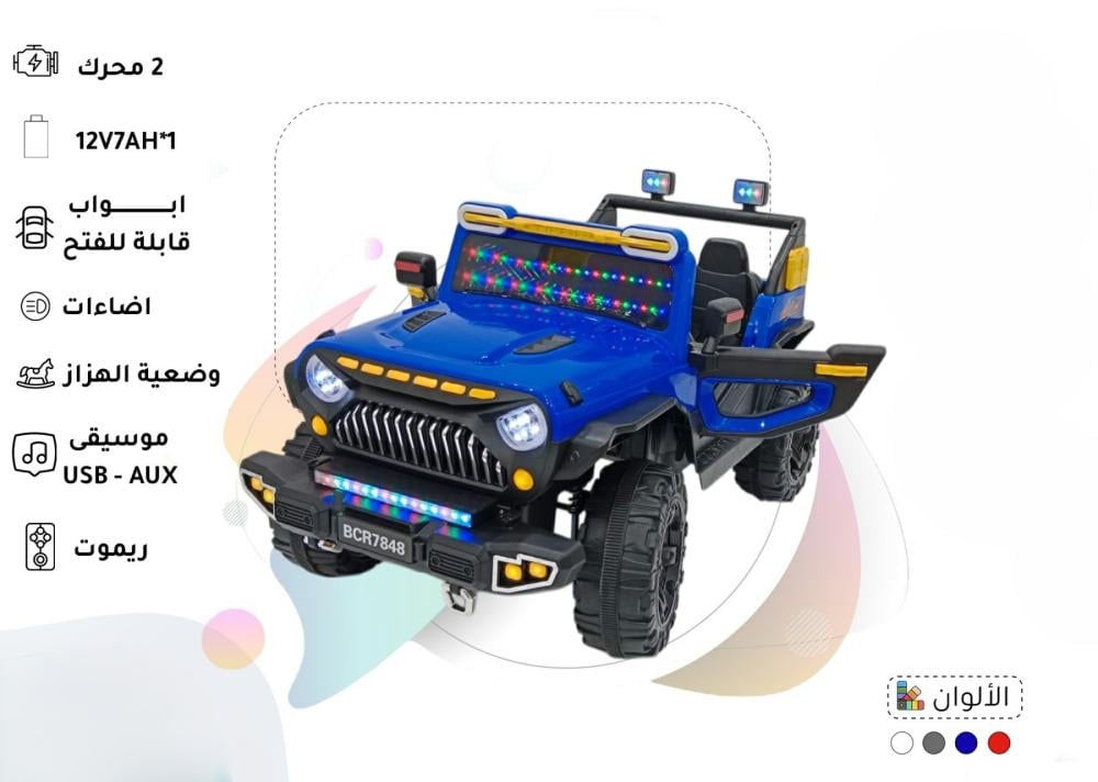 اجعلوا طفلكم يعيش تجربة قيادة مليئة بالحماس والقوة مع سيارة الأطفال الكهربائية ذات الدفع الرباعي بتصميم الجيب الجريء واللون الأزرق الزاهي! 🚀 هذه السيارة المدهشة، (والمتوفرة أيضاً بألوان أبيض ووردي)، مصممة لتقديم مغامرات واقعية وممتعة. مزودة بمحركين وبطارية 12 فولت 7 أمبير، وخصائص تفاعلية عديدة، ستشعل حماس طفلكم وتقوي مهاراته الحركية والتنسيقية وهو ينطلق في رحلاته الخاصة.