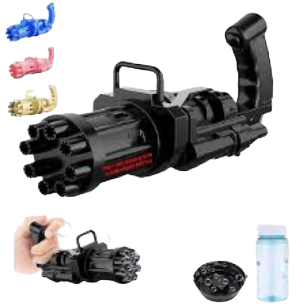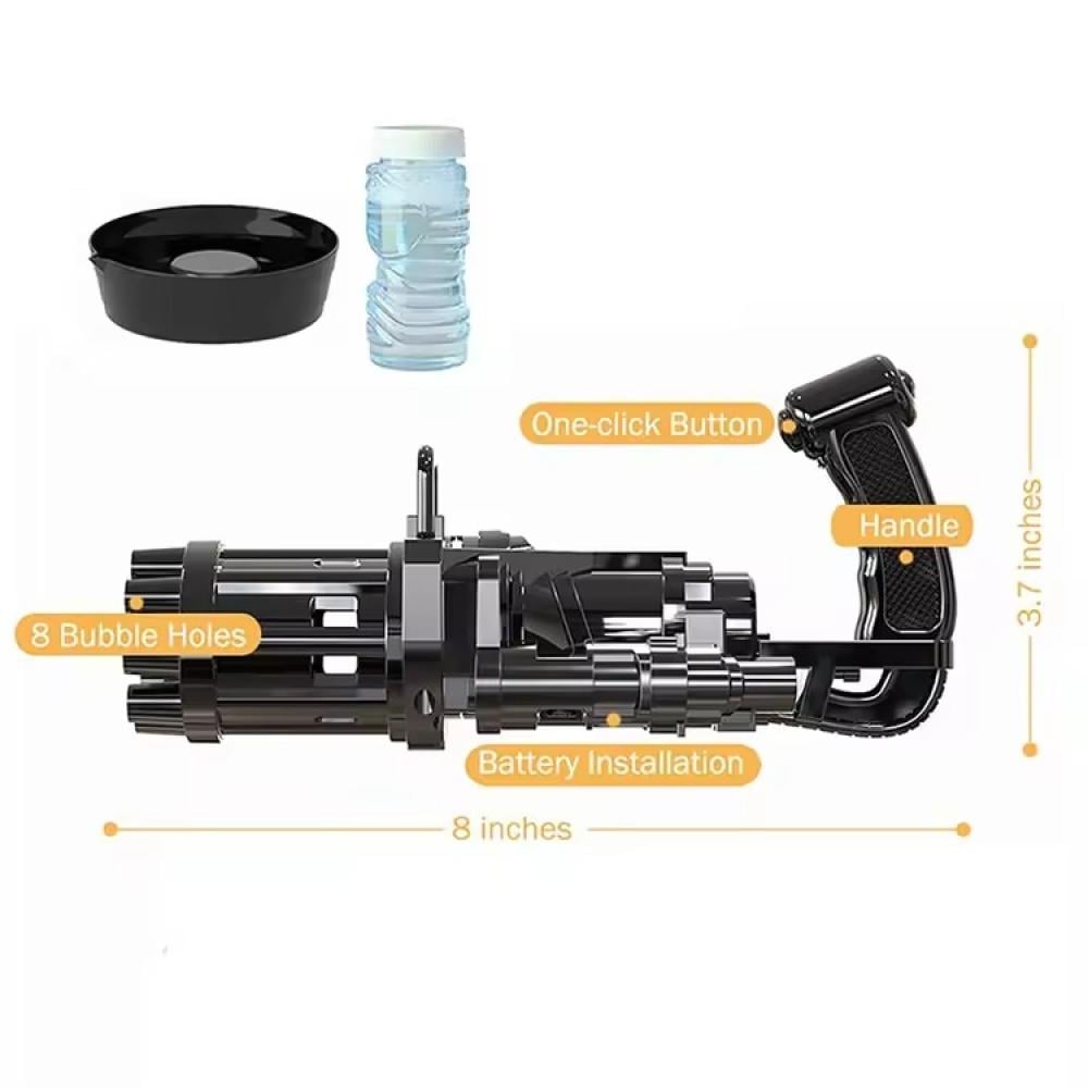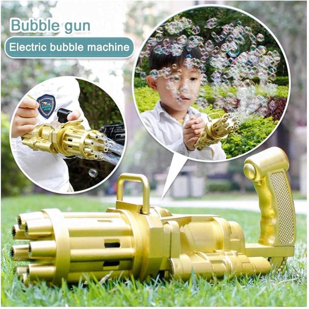 مخرجات فقاعات غنية : يمكن لآلة فقاعات جاتلينج ذات 8 فتحات إخراج أن تنتج مئات الفقاعات في الدقيقة، وسوف ينبهر الأطفال بعالم الفقاعات. كما يتم استخدام مسدس الفقاعات كمروحة صغيرة عند إزالة الطرف.