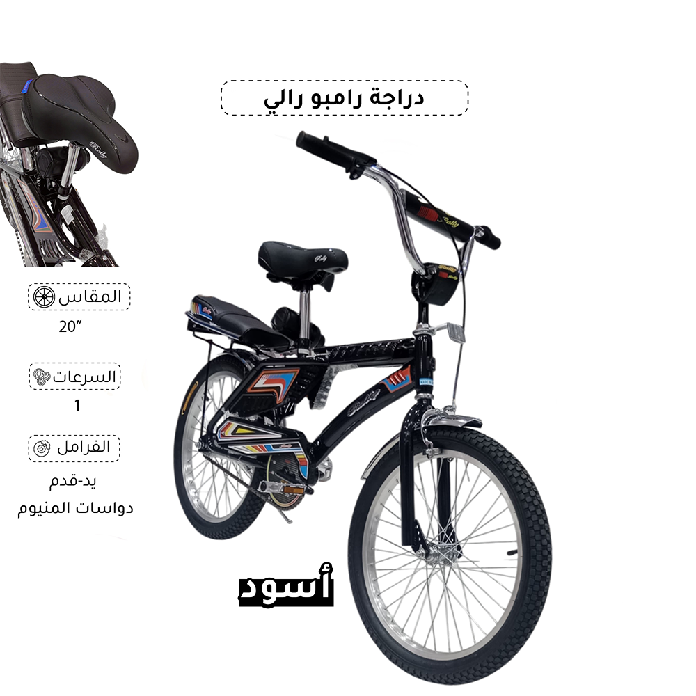 استمتع بالقيادة بثقة مع دراجة رامبو رالي باللون الأسود الكلاسيكي! 🚴♀️ تجمع بين الأناقة والمتانة، بمقاس 20 بوصة وسرعة واحدة لركوب مريح وسلس. مزودة بفرامل يد-قدم لـ توقف آمن وسريع، ودواسات ألمنيوم عالية الجودة لتحمل الاستخدام الشاق المكثف. 💯 اجعل مغامراتك اليومية أكثر إثارة!