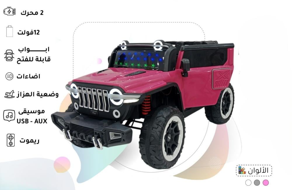 اجعلوا طفلتكم تعيش تجربة قيادة مليئة بالحماس والتشويق مع سيارة الأطفال الكهربائية ذات الدفع الرباعي بتصميم الجيب القوي واللون الوردي الزاهي! 🚀 هذه السيارة المذهلة، (والمتوفرة أيضاً بألوان أبيض وأزرق)، مصممة لتقديم مغامرات واقعية وممتعة. مزودة بمحركين وبطارية 12 فولت، وخصائص تفاعلية عديدة، ستشعل حماس طفلتكم وتقوي مهاراتها الحركية والتنسيقية وهي تنطلق في رحلاتها الخاصة.