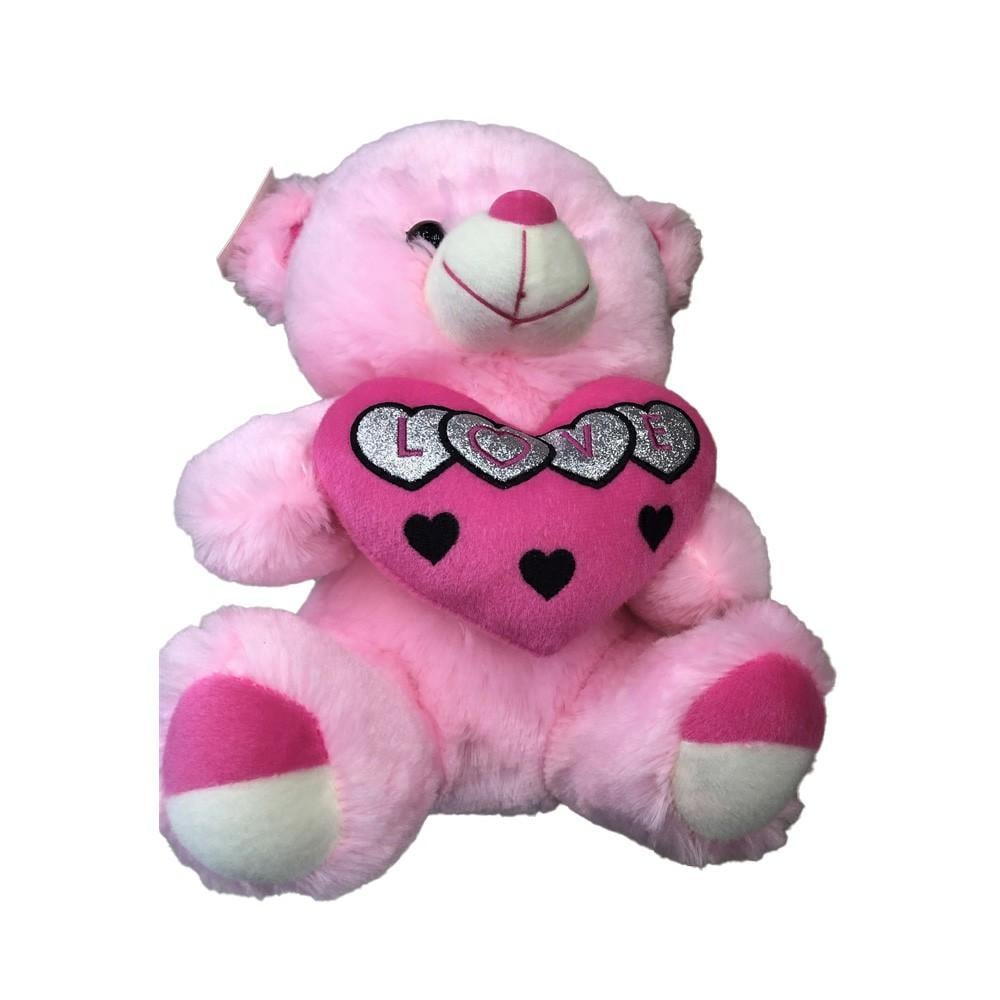 A soft and cuddly pink teddy bear holding a heart emblazoned with the word "LOVE" and covered in sparkly beads. Perfect for expressing love on special occasions like Valentine's Day or birthdays.